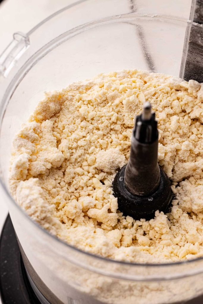 To avoid overworking the dough, process just until the ingredients are combined and the mixture resembles coarse crumbs. As soon as the dough begins to hold together when pressed, stop pulsing. Avoid running the food processor longer than necessary, and handle the dough gently when transferring it for rolling out.