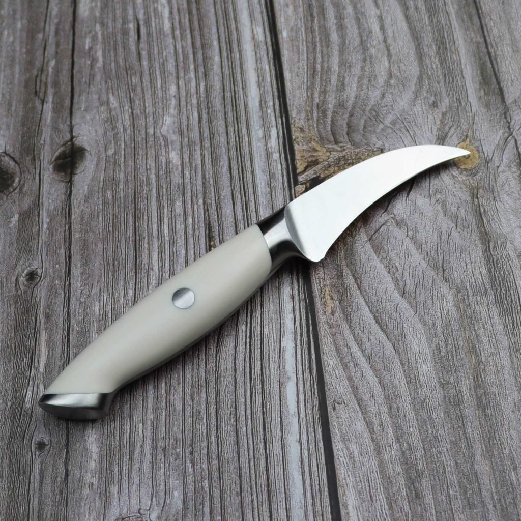 This small, curved knife is perfect for peeling fruits and vegetables. Its shape provides better control over intricate cuts and detail work. It is lightweight and easy to maneuver.